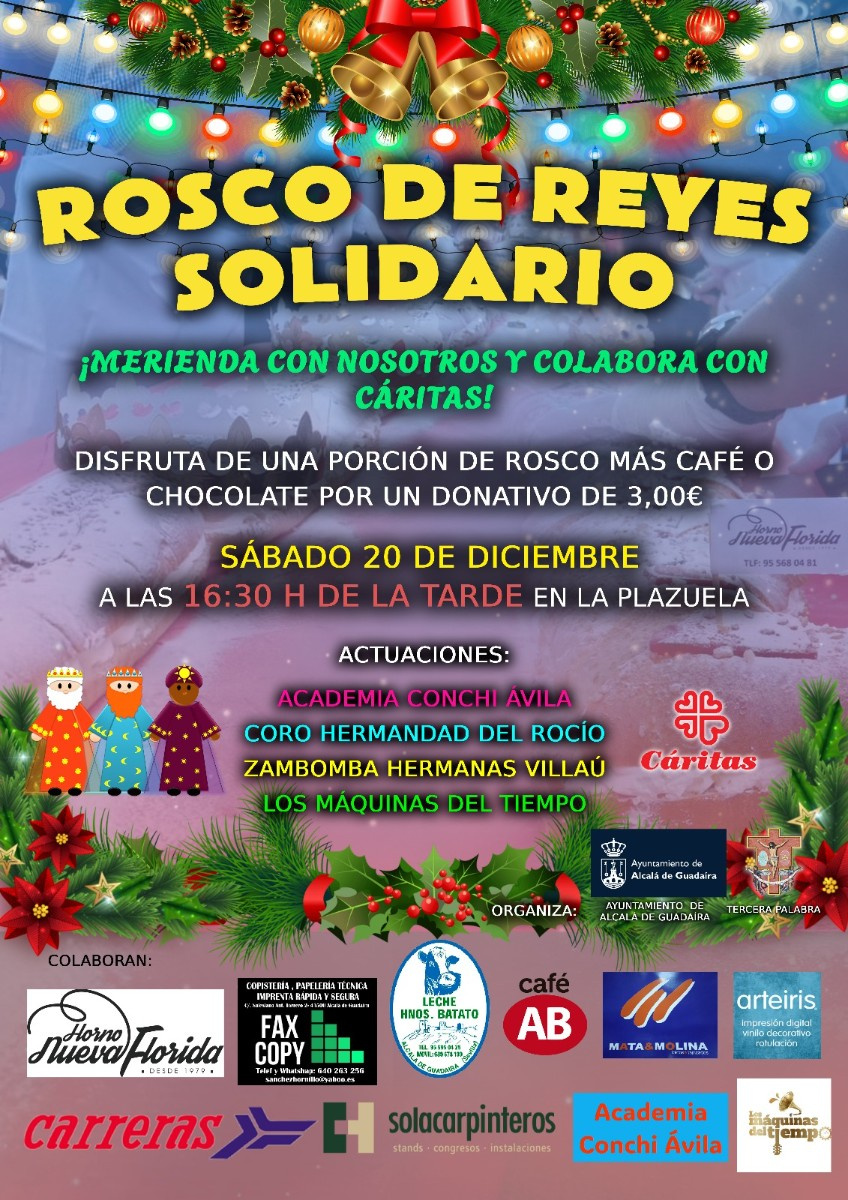 La delegación de Fiestas Mayores del Ayuntamiento junto con la Hermandad de La Tercera Palabra organizan el sábado 20 de diciembre en La Plazuela el Rosco de Reyes Solidario a beneficio de Cáritas.