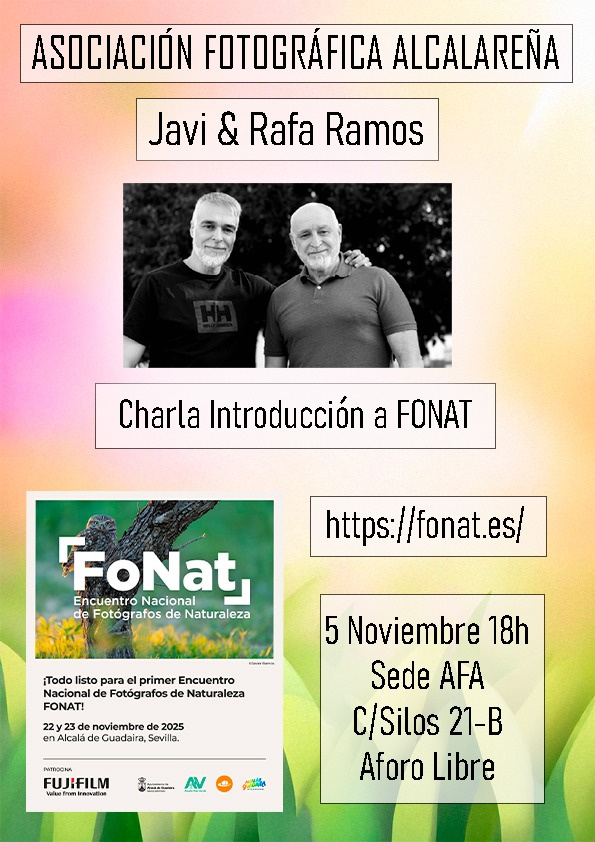 Previo a este encuentro y a modo de introducción se celebra el día 5 de noviembre a las 18.00 horas en la sede de la Asociación Fotográfica Alcalareña (AFA) la charla `Introducción a FONAT´ protagonizada por los hermanos fotógrafos de naturaleza de Alcalá de Guadaíra, Javi y Rafa Ramos.