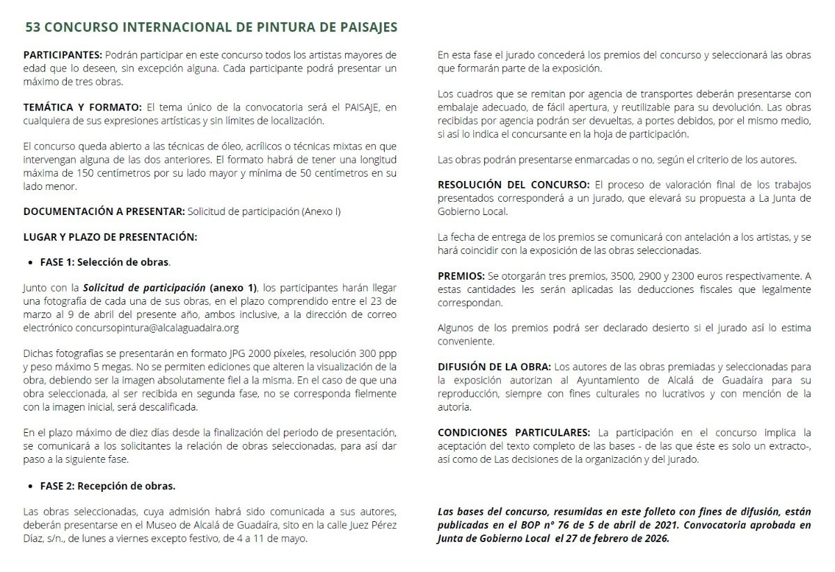 Las bases concretan que para el Certamen Internacional de Pintura puede presentarse cualquier artista mayor de edad con un máximo de 3 obras (150 cm de máximo por el lado más largo y 50 cm de mínimo por el lado menor). Las técnicas pueden ser óleo, acrílico o técnicas mixtas y el tema único el paisaje en cualquier expresión pictórica y sin límite de localización. Los premios son de 3.500€, 2.900€ y 2.300€ respectivamente para la primera, segunda y tercera obra ganadora.
