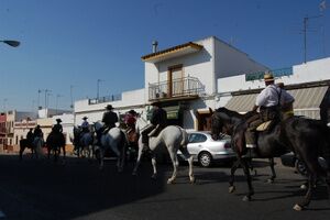 El coro de la Hermandad ha acompañado al Simpecado y ambientado carrozas y caballistas con sevillanas que bailaban los romeros y las juventudes de la congregación religiosa de la parroquia de la Inmaculada Concepción, iglesia donde está establecida canónicamente la imagen.