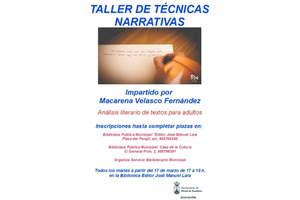Por otro lado se inicia un taller de técnicas narrativas, impartido por Macarena Velasco Fernandez. Macarena ha trabajado como correctora en la editorial Espasa Calpe y en este taller que coordinará de forma voluntaria , nos ofrece la posibilidad de adentrarnos en los textos literarios y aprender a analizarlos. Se trata de un taller muy interesante para todos aquellos que sientan cierta vocación u afición hacia la creación literaria, y para los que quieran profundizar en su experiencia lectora.