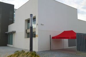 Dicha sala cuenta con una entreplanta donde se sitúa el almacén de medicamentos y la zona de descanso del personal voluntario de Cruz Roja, quedando la planta baja dividida en tres módulos asistenciales, uno como sala de curas, otra de enfermería y otra médica; todas con los medios técnicos necesarios tales como desfibriladores, monitores, camillas, etc…garantizando una asistencia profesional a los ciudadanos que así lo necesiten.