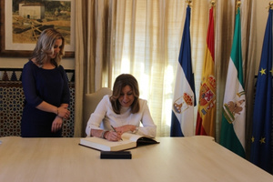 La alcaldesa de Alcalá de Guadaíra, Ana Isabel Jiménez, ha recibido hoy a la Presidenta de la Junta de Andalucía, Susana Díaz, en su primera visita institucional al Ayuntamiento de Alcalá. Tras saludar a la Corporación municipal y firmar en el libro de Honor, ha mostrado su interés y se ha comprometido con los proyectos y necesidades de la ciudad en materia de empleo, educación, infraestructuras, industria y turismo.