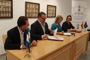 La portavoz del Gobierno, Ángeles Ballesteros, y el delegado de Turismo, Christopher Rivas han suscrito el protocolo de colaboración con el presidente de los panaderos alcalareños, Eulogio González.