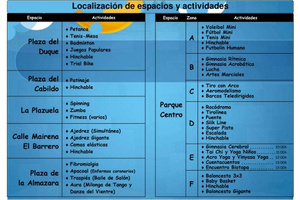 En la Plaza de la Almazara habrá stands informativos a cargo de entidades de ayuda a la A.F.A (Fibromialgia), APACOAL (pacientes coronarios), Traspiés y Aura. En la Plaza de El Barrero y calle Mairena se ofrecerá una partida de ajedrez simultánea, un ajedrez gigante, camas elásticas atracciones para los más pequeños. La Plazuela será un gran gimnasio a cielo abierto con macroclase de spinning y otras modalidades de fitness. En la Plaza del Cabildo patinaje e hinchable y en el Duque se organizarán partidas de petanca, tenis de mesa, badminton, multideporte y trial bici entre otros.