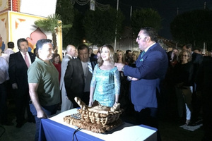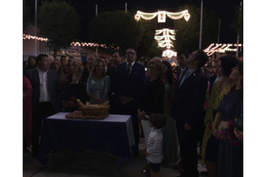 La alcaldesa, Ana Isabel Jiménez, acompañada por el resto de Corporación pulsó el botón del mecanismo que , escondido en un Pan de Alcalá, trajo la luz y abrió la fiesta oficialmente para alcalareños y visitantes.