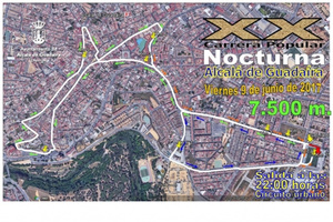 Será un recorrido circular urbano de 7.500 metros, entre la zona este y el centro de Alcalá que tendrá su salida a las 22 horas. Se realizará una primera vuelta a la barriada de Los Cercadillos por la Avenida Santa Lucía , Barcelona y Tren de los Panaderos, para volver a tomar Santa Lucía y acceder a la zona centro por la calle Arahal y Madueño de los Aires hasta La Plazuela. De allí tomará dirección hacia Nuestra Señora del Águila para seguir por Juan Abad y Nicolás Alpériz hasta la Plaza del Duque, Herreros, Alcalá y Orti, Plaza Cervantes, La Plata y Plaza El Paraíso. La carrera seguirá por Pérez Galdós, Calle Mairena y Santa Ana para salir del centro por la Avenida Antonio Mairena y volver al distrito este por la calle Barcelona y la Avenida Santa Lucía hasta llegar al estadio.
