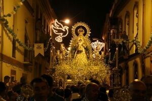 Tras los preparativos necesarios, a las 21.00 horas salía de su Santuario la imagen de la Patrona. Momentos emotivos a su paso por la iglesia de Santiago. Pétalos y aplausos al paso de la imagen por la calle principal del centro que lleva su nombre.
