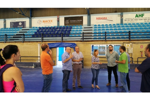 La alcaldesa de Alcalá de Alcalá de Guadaíra, Ana Isabel Jiménez, junto con el delegado de Servicios Urbanos y Deporte, Antonio G. Menacho, acompañados de los diferentes entrenadores de las escuelas deportivas municipales que hacen uso de estas instalaciones han visitado las obras que se están llevando a cabo en el Pabellón Plácido Fernández Viagas.