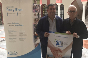 La Asociación Paz y Bien cumple 30 años de presencia en Alcalá de Guadaíra y quiere que todo el mundo se sume a la fiesta. Su vicepresidente y fundador, Rafael Pozo, acompañado del delegado municipal de Servicios Sociales, José Antonio Montero, ha presentado hoy en el Ayuntamiento el programa conmemorativo del 30 aniversario, cuyo acto central tendrá lugar el martes día 7 (17:30 h) en el Teatro Gutiérrez de Alba. Pozo ha invitado a todos los alcalareños a participar de la celebración y compartir “nuestro patrimonio, personas felices e ilusionadas con el trabajo que llevan a cabo a diario”.