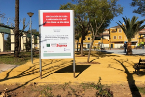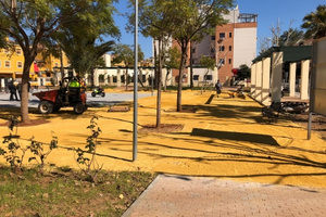 Las obras del Plan Supera en esta plaza han permitido la eliminación de setos y la fuente ornamental que no tenía uso alguno, permitiendo la creación de una explanada pavimentada en torno a los juegos infantiles. Igualmente, se ha mejorado la superficie de albero igualando la cota de la zona pavimentada para eliminar desniveles, se han colocado nuevas papeleras, reparado los pilares de pérgolas y se ha realizado la canalización correspondiente para la instalación del alumbrado público en la calle próxima a la plaza.