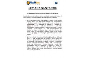 La empresa concesionaria del servicio de transporte urbano colectivo de pasajeros, Alcalá Bus del Grupo Ruíz, ha informado que para los días de la Semana Santa alcalareña contará con dos líneas circulares especiales en las horas centrales del día y acomodándose a las necesidades de cierre al tráfico rodado en las zonas de comitivas.