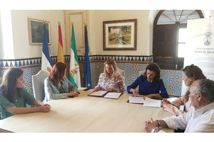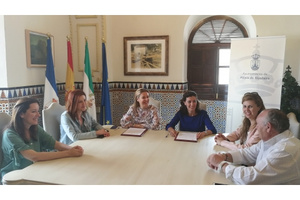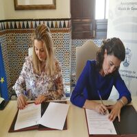 La alcaldesa de la ciudad, acompañada de la delegada de Patrimonio M.ª Ángeles Ballesteros y la gerente de la empresa, María del Carmen García Oliveros han firmado el acuerdo de cesión de la escultura, que como ha detallado la alcaldesa, supondrá un reconocimiento por parte de la ciudad a esta empresa familiar, comprometida con el empleo de Alcalá y cuyo origen se remonta al año 1978.