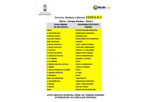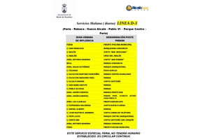 Teniendo en cuenta este horario, Alcalá Bus dispondrá de tres líneas que funcionarán en los turnos de mañana y cinco líneas en los de noche y madrugada con la misma validez de precios y tarjetas que los recorridos habitales del resto del año. Así, por la mañana se habilitará la línea D1 (Feria-Campo de las Beatas-Feria), la D2 (Feria-Silos-Instituto-Barriada La Liebre-Feria) y la línea D3 (Feria-Rabesa-Nueva Alcalá-Pablo VI- Parque Centro- Feria).