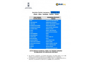 Atendiendo a la gran cantidad de ciudadanos que se desplazan cada año a la Feria en autobús en horario nocturno, se habilitan cinco líneas. La N1 con dos vehículos (Feria-Campo de las Beatas-Feria), la línea N2 (Feria-Instituto-Centro-Feria), la N3 (Feria-Beca-Pablo VI-Malasmañanas-Centro-Feria), la N4 (Feria-Silos-Instituto-Centro-Feria) y la línea N5 (Feria-Avda Mar Mediterráneo-Bda. La Liebre-Instituto-Beca-Feria).