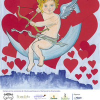 El cartel, con tonos rojos y azules representa el reparto de corazones para toda Alcalá por parte de cupido, símbolo del día de San Valentín.