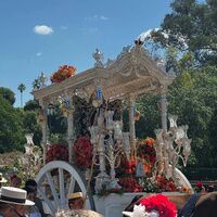 En este año tan especial que la Hermandad del Rocío de Alcalá cumple su cuadragésimo aniversario, el Simpecado en carreta porta el escudo de plata de la ciudad que con tanto orgullo la alcaldesa entregó hace un mes al Hermano Mayor de la Hermandad.