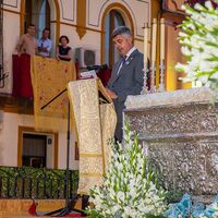 Autoridades civiles y numeroso público, con gran presencia de mujeres de mantilla, se congregaron en la Solemne Misa Pontifical oficiada por el Obispo auxiliar de Sevilla, Ramón Darío Valdivia Jiménez y concelebrada por los párrocos y sacerdotes de Alcalá. El altar estaba presidido por la imagen de la Virgen del Águila, entronizada en su paso.