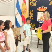 La alcaldesa de la ciudad, Ana Isabel Jiménez, acompañada por la delegada de Servicios Sociales, Rocío Bastida han recibido a los menores que pasan estos meses estivales en la ciudad