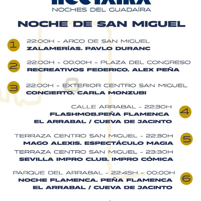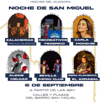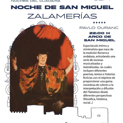 Bajo el arco del mismo nombre, pórtico del barrio desde la calle San Fernando, la Noche de San Miguel dará comienzo con 'Zalamerías' de Pavlo Duranc, un espectáculo que nace de la tradición flamenca andaluza, articulando una serie de escenas musicalizadas y teatralizadas que incluyen poemas, textos e historias con las que difundir el flamenco desde diferentes perspectivas.