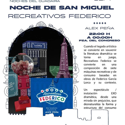 También desde las 22 horas, la Plaza del Congreso acogerá un evento especial gracias a una instalación artística de Alex Peña que, por medio de siete máquinas recreativas y de consumo, abundan en la obra de Federico García Lorca y su contexto. El espectáculo reflexiona sobre la mercantilización del legado artístico con humor, crítica y poesía. Por su parte, en la escalinata del Centro San Miguel actuará Carla Monzibu, artista cantautora con un estilo musical que abarca el jazz, pop y rock clásico.