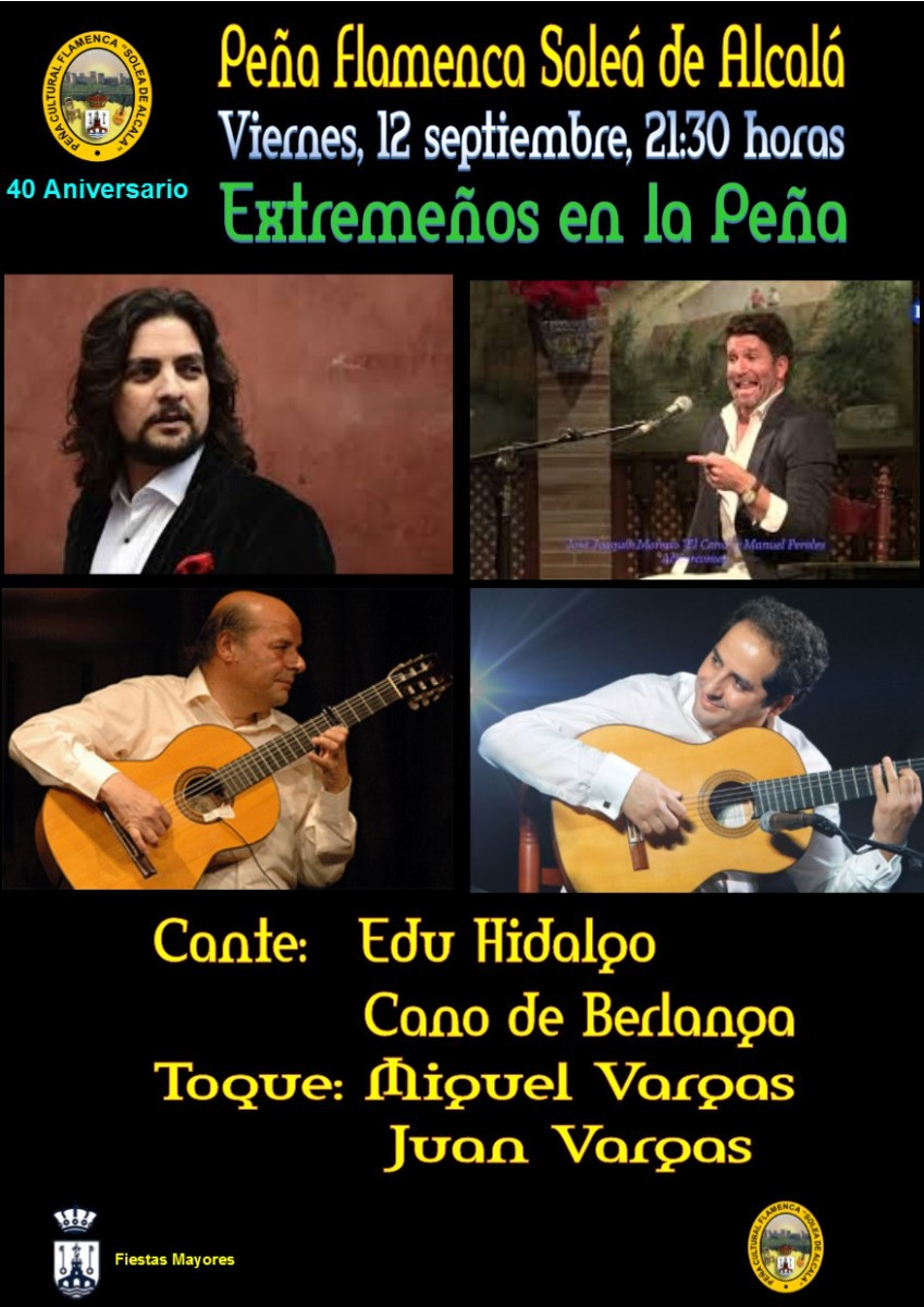 Paralelamente, la peña Flamenca Soleá de Alcalá ha organizado con motivo del Día de Extremadura el recital flamenco ‘Extremeños en la Peña’ para este próximo viernes 12 de septiembre (21:30 horas) en su sede de la calle José García Alcalareño. Cantaores de esta tierra con la que Alcalá se siente tan unida demostrarán la unión también en las tradiciones con la participación de Edu Hidalgo y Cano de Berlanga al cante, y Miguel Vargas y Juan Vargas al toque.