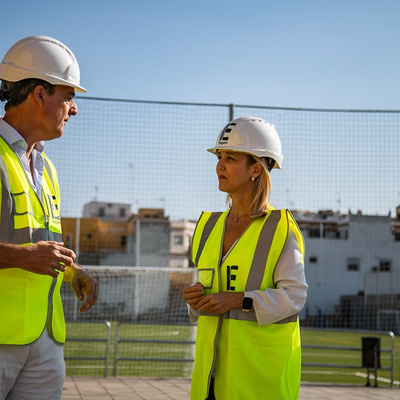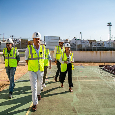 La alcaldesa de la ciudad, Ana Isabel Jiménez, acompañada de los delegados municipales de Deporte, Pedro Gracia, y de Hábitat Urbano, David Delgado, ha visitado las obras que el Ayuntamiento de Alcalá de Guadaíra, a través de la delegación de Hábitat Urbano y Equipamientos Municipales, ha iniciado para disponer de un recinto cubierto para la práctica de deportes como fútbol sala, balonmano, gimnasia, etc en el Complejo Deportivo de Pablo VI.