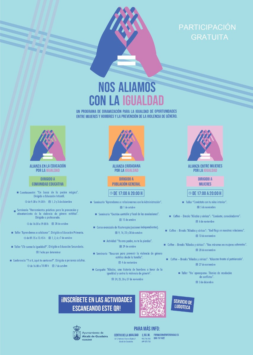 Este taller, que se desarrolla hasta el 7 de octubre, abre la programación de otoño ‘Nos aliamos con la Igualdad’ impulsada por el Ayuntamiento a través de esta Delegación. El objetivo es la promoción de la igualdad de oportunidades entre mujeres y hombres y la prevención de la violencia de género. Los contenidos están enfocados tanto al público en general, como a la comunidad educativa de primaria y secundaria, contando además con actividades específicas para las asociaciones, la población femenina y colectivos profesionales.