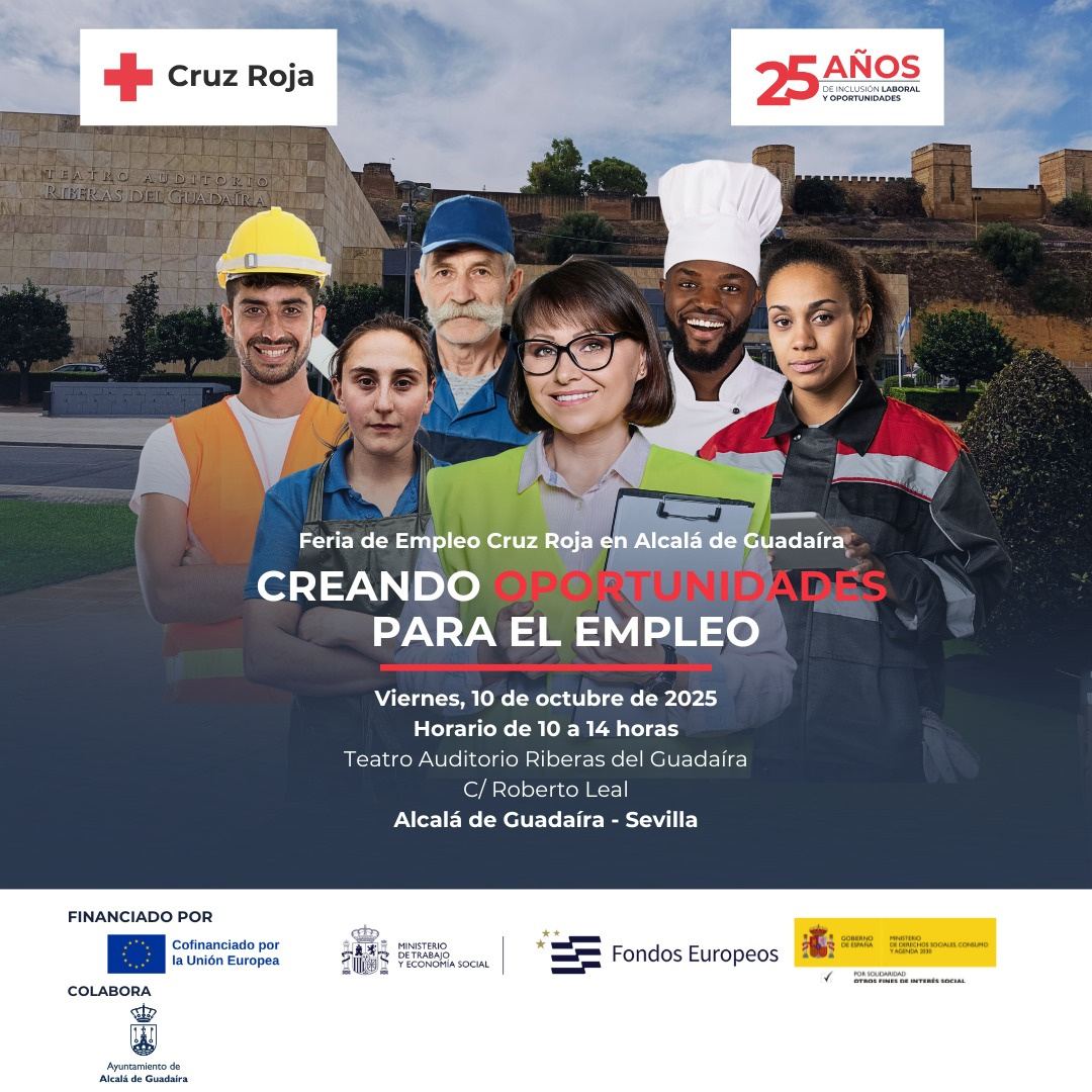Alcalá de Guadaíra acoge la Feria ‘Creando Oportunidades para el Empleo’ abierta a toda la población con stands empresariales, contactos con departamentos de recursos humanos, talleres, herramientas de búsquedas de empleo, o técnicas de superación, entre otros. Será el viernes 10 de octubre en el Teatro Auditorio Riberas del Guadaíra organizado por Cruz Roja con la colaboración del Ayuntamiento y la financiación de fondos europeos a través del Gobierno de España.