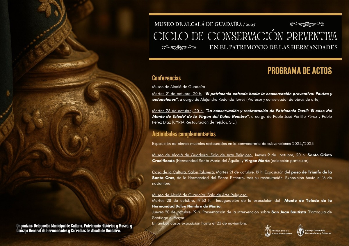 Muchos de estos elementos además pueden disfrutarse por el público en general tras su recuperación este mes de octubre en el Museo y la Casa de la Cultura en el I Ciclo de ‘Ciclo de conservación preventiva en el patrimonio de las hermandades’ que “nace con el objetivo de ahondar en la importancia de la conservación y puesta en valor de los tesoros de arte religioso de la ciudad como parte del patrimonio identitario local. Precisamente ésta, la visibilidad del patrimonio artístico privado o más desconocido y su puesta en valor, es la filosofía con la que se dan la mano la convocatoria de subvenciones y el ciclo de conferencias y exposiciones de los bienes recuperados”- ha referido Rivas.