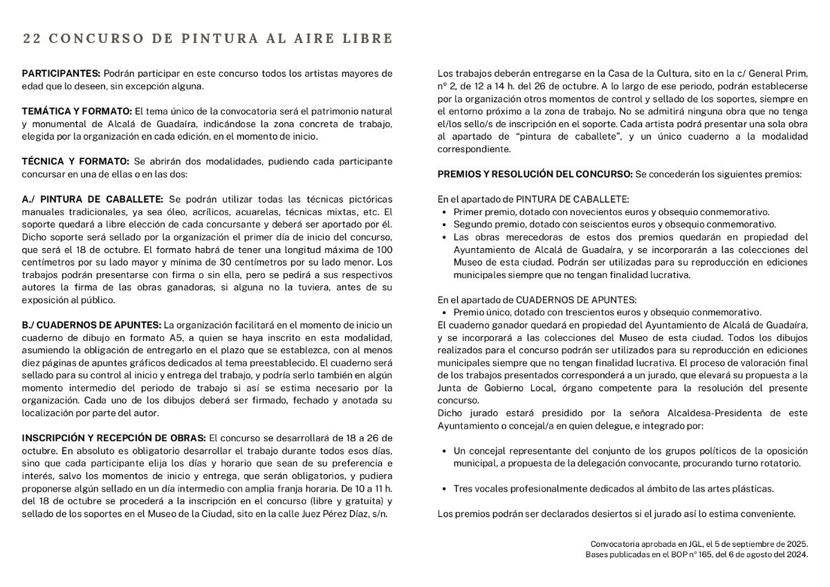Las bases recogen que el certamen está abierto a la participación de todos los artistas mayores de edad que lo deseen. El tema único de la convocatoria será el patrimonio natural y monumental de Alcalá de Guadaíra, especificándose el lugar concreto de trabajo en el momento del inicio del concurso.