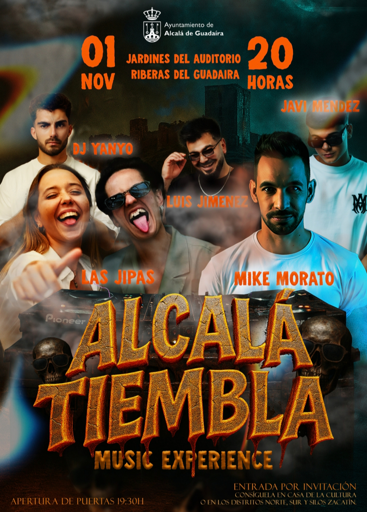 El día 1 de noviembre llegará “Alcalá Tiembla” la actuación de DJ Yanko, Javi Méndez, Las Jipas, y Mike Morato. Será a las 20h, con entrada por invitación gratuita que se puede obtener en la Casa de la cultura, y en los distritos Norte, Sur y Silos Zacatín. La apertura de puertas será a las 19.30 horas.Las entradas a partir de mañana día 28 a las 10 horas.