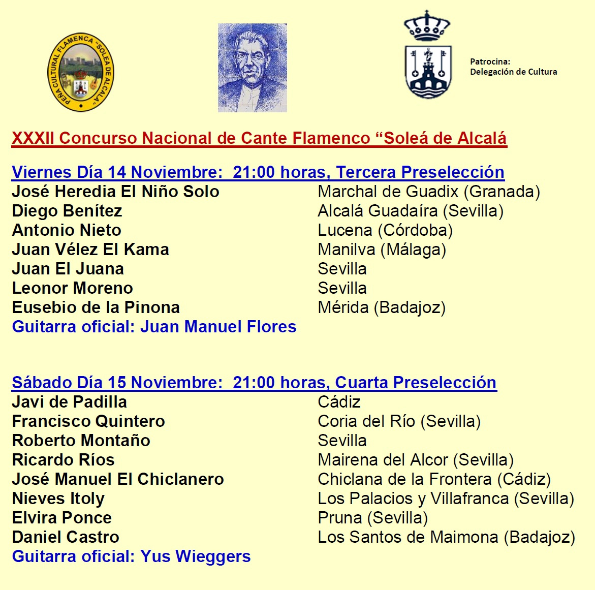 Asimismo, en la Peña Flamenca La Soleá de Alcalá (C/ José Alcalareño s/n) continúa el reconocido Concurso de Cante Flamenco Soleá de Alcalá, ya en su XXXII edición con las preliminares. Viernes y sábados a las 21 horas con cantaores provenientes de toda Españas, especialmente de Andalucía y Extremadura. Se intercalan entre 7 y 8 actuaciones cada noche para llegar a la gran final el próximo 29 de noviembre. (Entrada libre y gratuita hasta completar aforo)