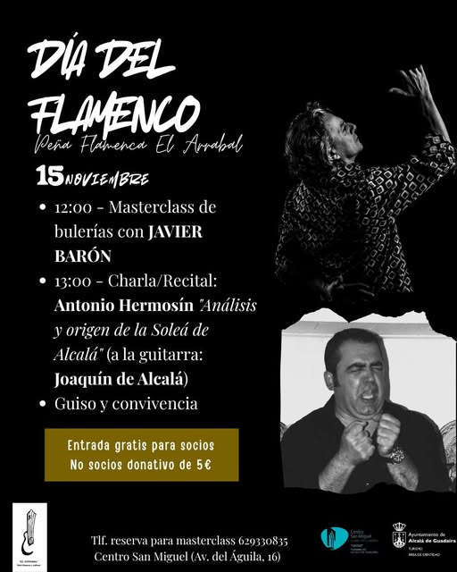 Muy esperada es también la cita, con motivo de este día especial, se desarrolla en el centro municipal San Miguel organizada por la Peña Flamenca el Arrabal, la MasterClass del reconocido bailaor local Javier Barón, orgulloso de su tierra natal. Este sábado, 15 de noviembre, a partir de las 12 horas de la mañana, tendremos la masterclass de bulerías con Javier Barón a la que se unirá a una charla recital por parte del cantaor local Antonio Hermosín sobre `Análisis y origen de la Soleá de Alcalá’ y que culminará con una jornada de convivencia. La entrada es gratis para socios de la peña y, para los que no son socios, el precio es un donativo de 5 euros. Para reservar masterclass hay que consultar al teléfono: 629330835 .