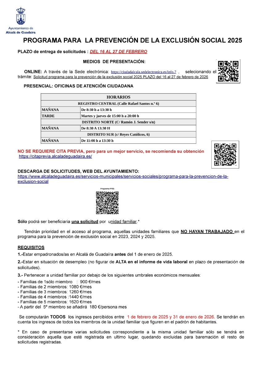 Se podrá presentar una solicitud por ‘Unidad Familiar’, priorizándose las personas o familias que no se hayan beneficiado de este programa en los últimos 3 años. Entre los requisitos se encuentra estar empadronado en Alcalá de Guadaíra como mínimo desde el 1 de enero de 2025, y ser demandante de empleo en la fecha de entrega de la solicitud, además de no sobrepasar unos ingresos máximos estipulados contemplados en los requisitos previstos por la Diputación Provincial.