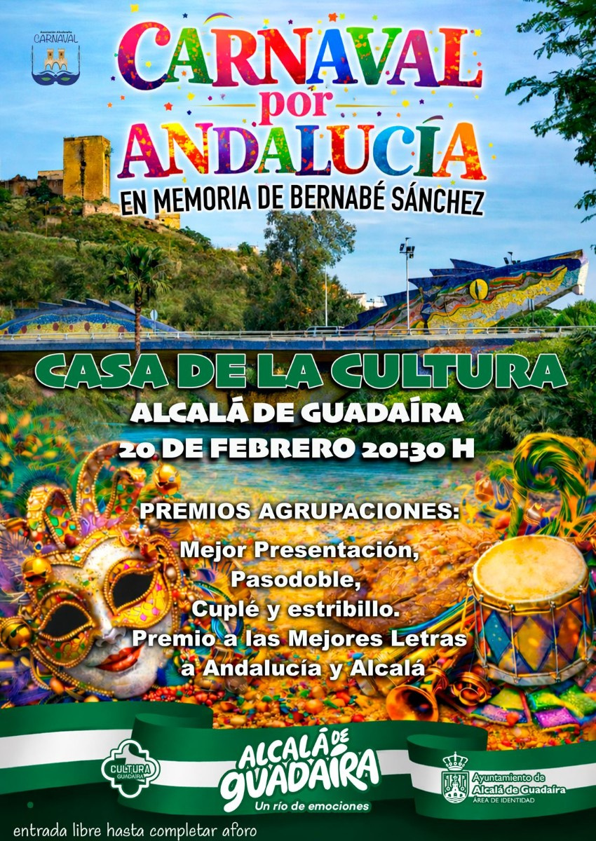 El viernes 20 de febrero (20:30h con entrada gratuita), en colaboración con la Asociación Alcalareña del Carnaval, se ha organizado un concurso de coplas bajo el nombre de ‘Carnaval por Andalucía’, que rendirá homenaje a Bernabé Sánchez por su labor a favor de esta fiesta de amplia tradición en la localidad. La cita promociona esta seña de identidad local y andaluza y tendrá diversos premios, entre ellos a la Mejor Copla a Alcalá y a la Mejor Copla a Andalucía.