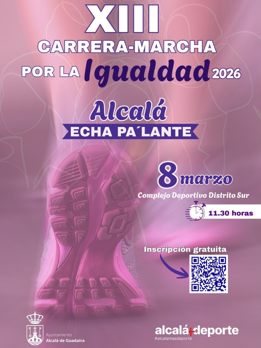 El mismo 8M, domingo, se celebra la XIII Carrera por la Igualdad ‘Alcalá echa pa'lante’ a partir de las 11:30h desde el Complejo Deportivo Distrito Sur, una cita multitudinaria en la que cada año la población alcalareña de todas las edades se unen en una jornada lúdica para reivindicar la igualdad a través del deporte.