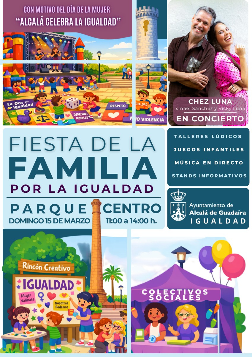 El domingo 15 de marzo la actividad se traslada al Parque Centro, de 11h a 14 horas, con la Fiesta Familiar por la Igualdad que combina música en directo, actividades lúdicas, educativas y culturales con acciones de sensibilización en materia de igualdad y corresponsabilidad. Dirigida principalmente a la infancia y a las familias, contará con talleres, juegos, música y stands, junto a la participación de entidades y colectivos sociales vinculados al ámbito de la mujer, configurándose como una jornada de convivencia y concienciación abierta a toda la ciudadanía ciudadana.