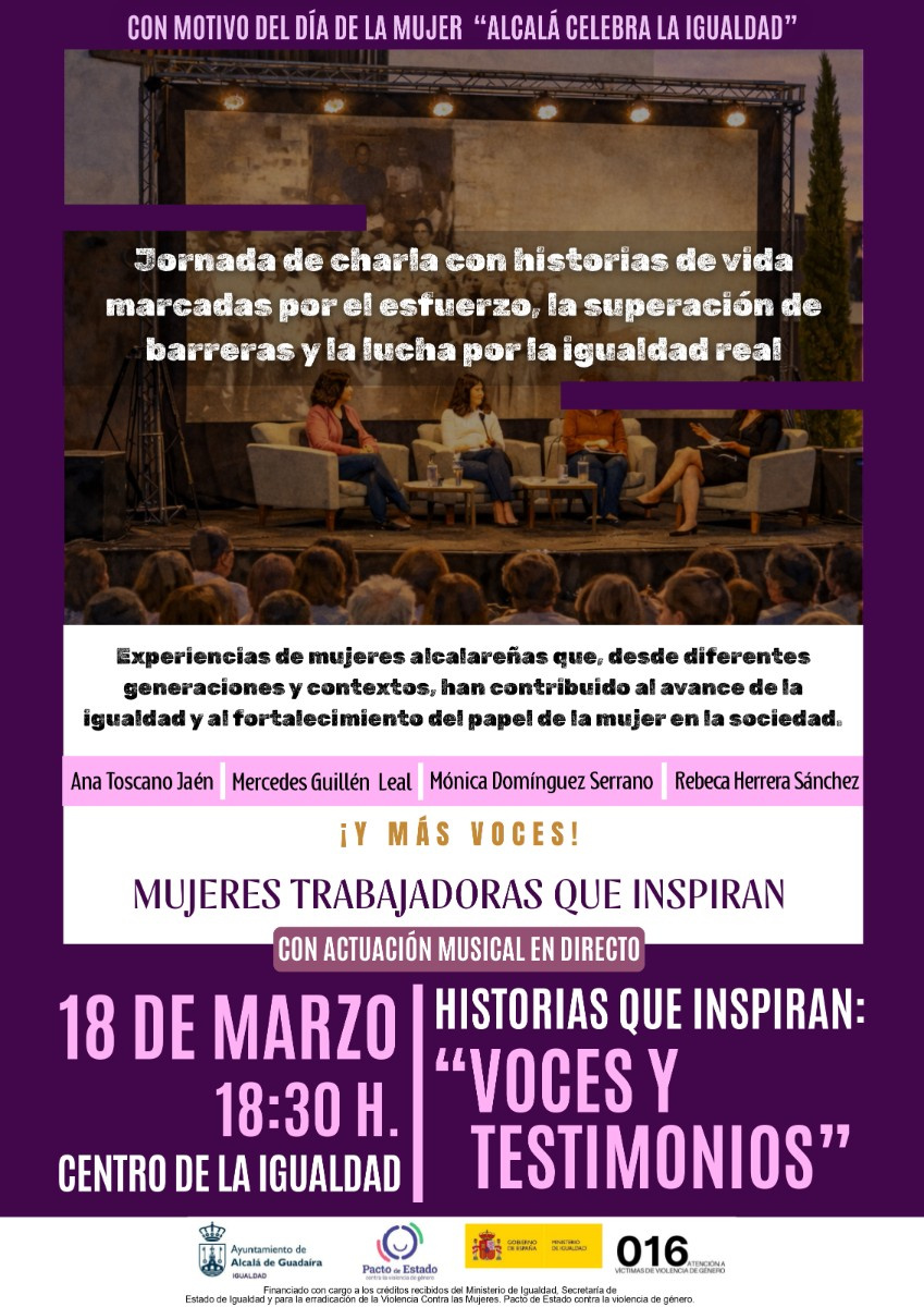 Mujeres talentosas, inspiradoras, luchadoras y valientes van a contar sus historias de vida y nos harán disfrutar de la música en las dos últimas actividades con las que el Ayuntamiento de Alcalá de Guadaíra, a través de la Delegación de Igualdad, cierra esta semana su programación del 8M, Día Internacional de la Mujer. Este miércoles 18 de marzo se celebrará el encuentro ‘Historias que inspiran: Voces y testimonios’ con mujeres que han contribuido al avance de la igualdad, y el jueves 19 dos polifacéticas artistas nos llevarán a hacer un recorrido musical a través del concierto ‘Sonidos de Mujer’.