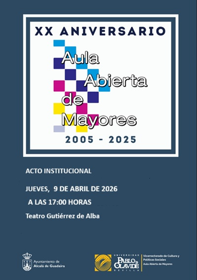 Alcalá de Guadaíra celebrará un acto institucional dentro de las actividades conmemorativas del XX Aniversario del Aula Abierta de Mayores, iniciativa universitaria para mayores de 50 años que se desarrolla en la localidad en colaboración con la Universidad Pablo de Olavide. Será el 9 de abril (17:00 horas) en el Teatro Gutiérrez de Alba.