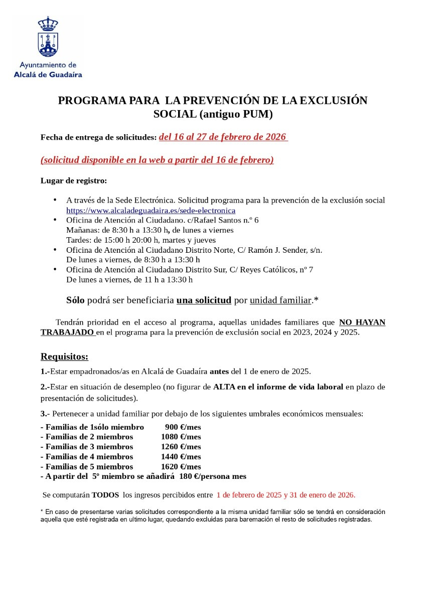 El Ayuntamiento de Alcalá de Guadaíra abre del 16 al 27 de febrero el plazo de solicitudes del Programa para la Prevención de la Exclusión Social (conocido popularmente como PUM), iniciativa que propicia contrataciones de urgencia y de carácter temporal a personas que atraviesen con problemas socio-económicos desfavorables.